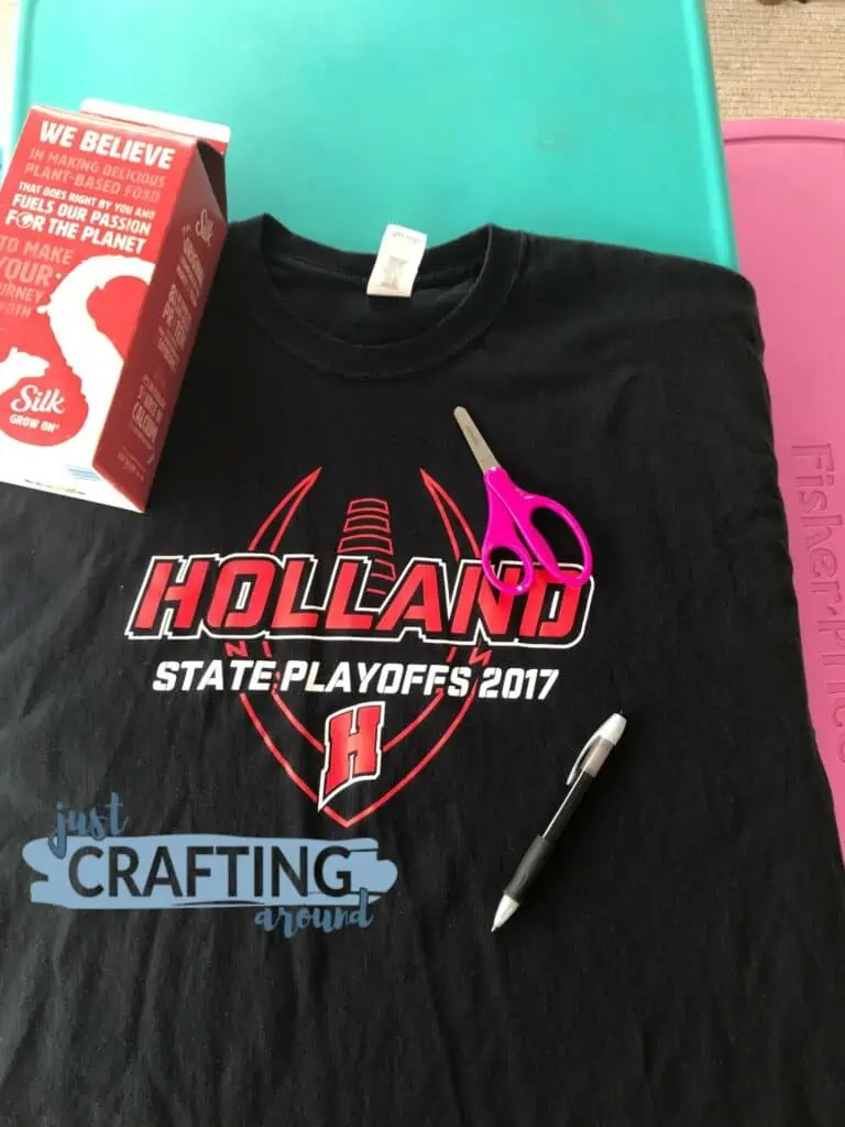 I had a t-shirt that the neckline was too tight, so I tried out this technique. To complete I used: scissors, I didn’t have a ruler, so I used an empty milk carton, and a t-shirt.